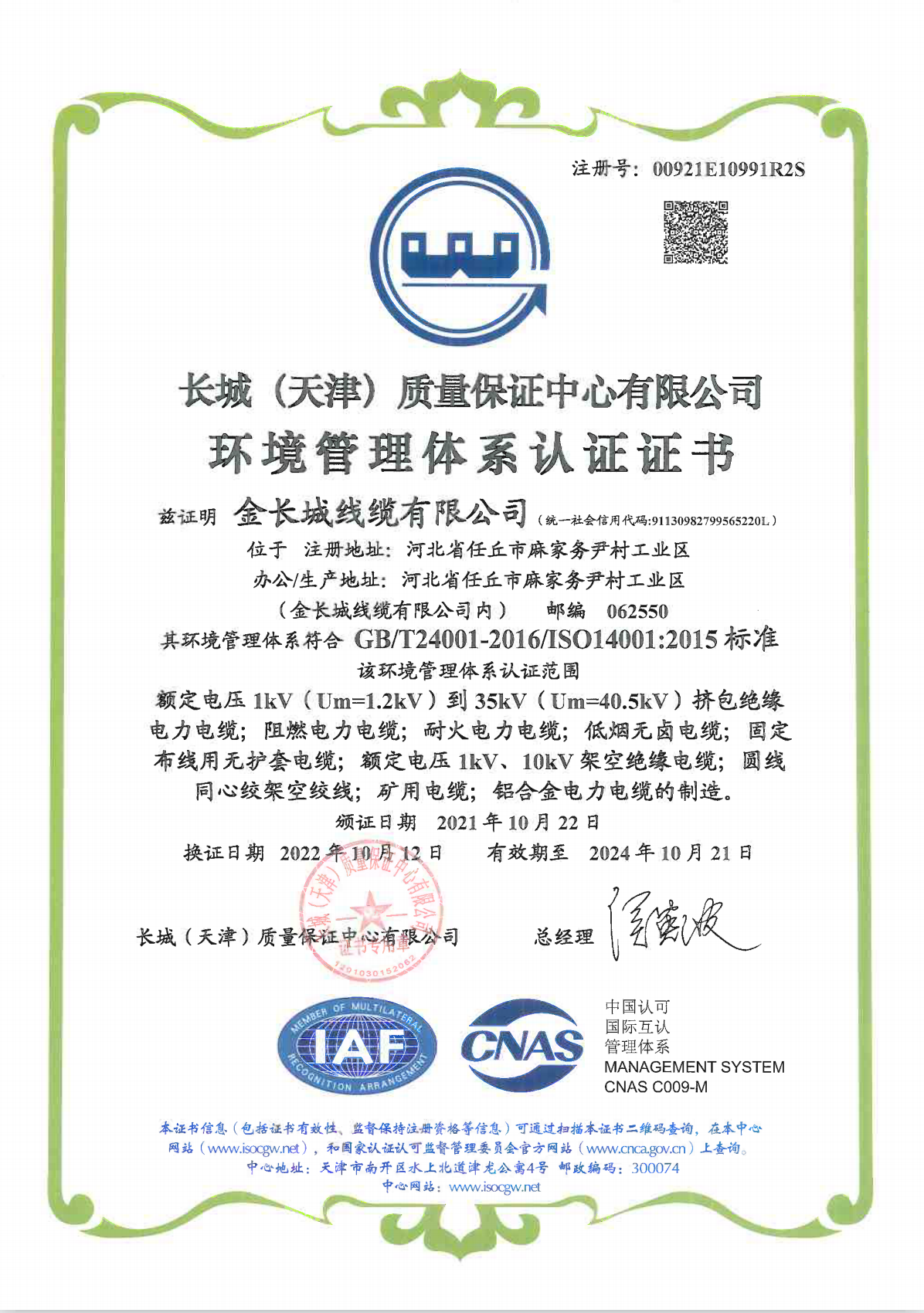 ISO14001环境管理体系认证证书(中文)